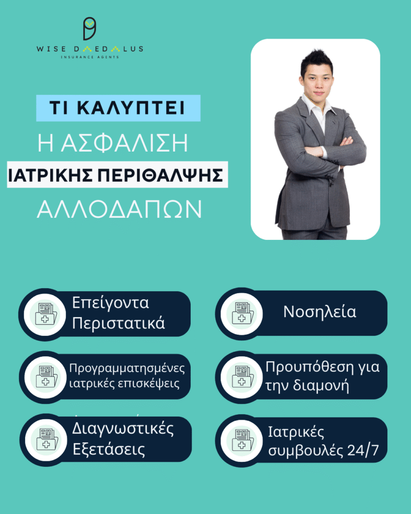 Η διαμονή και η εργασία σε μια νέα χώρα φέρνουν προκλήσεις, αλλά η υγεία σας δεν πρέπει να είναι μία από αυτές. Η Wise Daedalus Insurance Agents προσφέρει εξειδικευμένα προγράμματα ασφάλισης ιατρικής περίθαλψης αλλοδαπών, σχεδιασμένα να παρέχουν πλήρη κάλυψη και να διευκολύνουν τις διοικητικές διαδικασίες στην Ελλάδα.